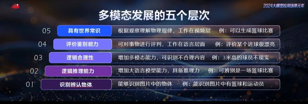 所以,做一个总结。多模态我觉得有五个发展层次,这是我的版权。比如说,我举个例子,如果有一场篮球赛,机器识别,多模态识别分为五个层次。