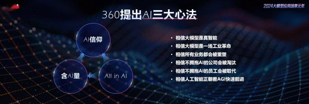 所以,在这个领域,我觉得2024年可能是360和很多创业公司的一个焦点,就是把大模型往垂直化,往深了走,往垂直的场景化走,这会带来很多好处。第一,不需要万亿、千亿的模型,在企业内部只需要百亿模型,因为我不需要又会写诗,又会读英语,又会写文言文,还会解脑筋急转弯问题,就帮助企业解决企业内部一个比较重要的应用场景的问题。像我们不需要在每个公司雇一个爱因斯坦,我们雇一个大学本科生,在税务、财务、HR方面专项培养一两年,有企业内部知识的加持,他在垂直领域可以成长成在企业独当一面的一个优秀人才。